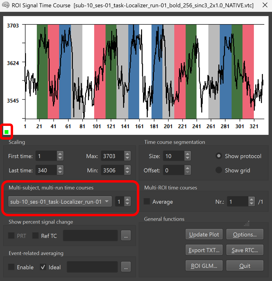 It can also be useful to explore the time courses of potential regions of interest to see the patterns and make sure that activation differences are not driven by noise (e.g., spikes). Find the region you think most likely to correspond to left LOTChand. Remember the data are in the radiologic convention. Move the crosshairs there, left-click to select Show ROI time course, click the green box in the lower left of the time course window to expand it, and explore the time course from the two runs.