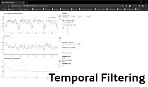 1) Fit the GLM (use Optimize GLM if you like) for Voxel 1 and note the beta weights, squared error, and pattern of residuals. Adjust the Minimum Freq slider to 0.01 Hz (without adjusting the Maximum Freq slider just yet). This means you are filtering out any frequencies below 0.01 Hz (and passing any frequencies above that cutoff). Refit the GLM and again note the beta weights, squared error, and pattern of residuals.